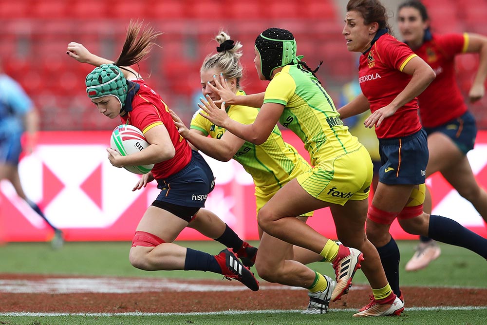Spain’s Beatriz Dominguez Sanchez charges through the Australia defense on day one of the HSBC World Rugby Women’s Sevens Series in Sydney on 1 February, 2019. Photo credit: Mike Lee – KLC fotos for World Rugby