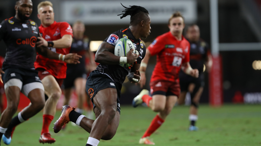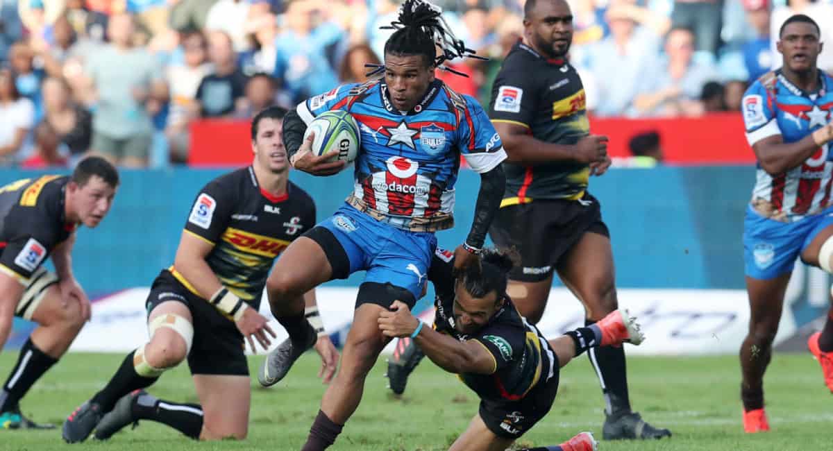 Rosko Speckman de los Bulls tomado por Dillyn Leyds de los Stormers durante el Super Rugby 2019 entre Bulls y Stormers en el Loftus Versveld Stadium, Pretoria el 16 de febrero de 2019 © Muzi Ntombela / BackpagePix