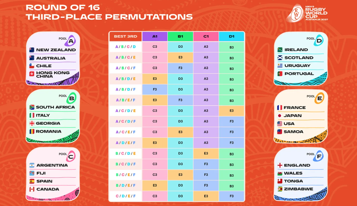 La Copa Mundial de Rugby Masculina 2027 contará por primera vez con seis grupos de cuatro y una ronda de octavos de final. Los dos mejores equipos de cada grupo y los cuatro mejores terceros clasificarán a la fase eliminatoria.