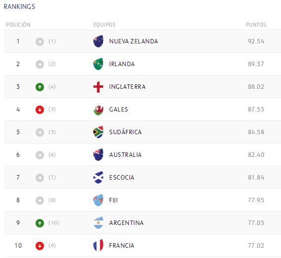 Francia, que ganaba 16 a 0 en el primer tiempo, finalmente cayó 24 a 19 – una recuperación histórica en el Seis Naciones – cayó al décimo puesto, su peor ranking desde que comenzaron estos en octubre de 2003. El beneficiario es Argentina que subió un puesto.